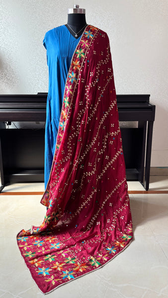 Sohni – As the name suggests, this Phulkari dupatta is a celebration of beauty and grace. Crafted on a rich maroon base, it is adorned with vibrant hand-embroidered floral motifs and gota patti patterns that reflect timeless Punjabi artistry. The colorful border blooms like a garden, making Sohni not just a dupatta, but a statement of heritage, elegance, and charm.