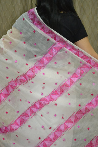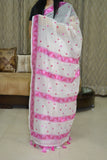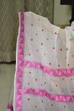 This is an exquisite saree hand made by our Phulkari Artists in Patiala. Kota Net base of this white saree has very heavy phulkari embroidery on the pallu. Similar traditional phulkari motifs have been embroidered all over the saree. This saree comes with a hand embroidered blouse piece.